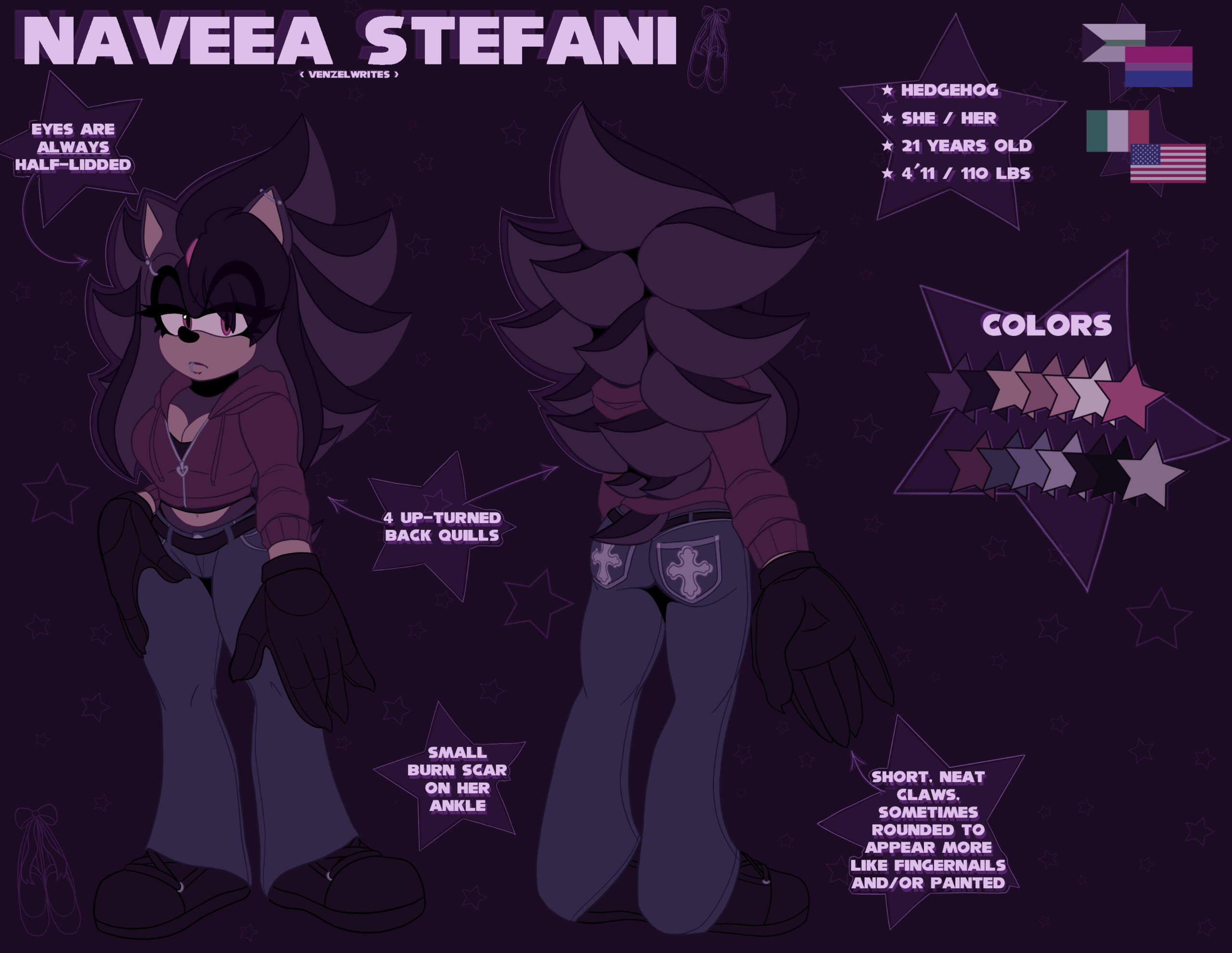 NAME Naveea Stefani NICKNAME/ALIAS Nav', 'Veea, Steffy AGE 21 DATE OF BIRTH 3 Oct GENDER & PRONOUNS Female, She / Her ORIENTATION Bisexual / Demiromantic SPECIES/ETHNICITY Mobian Hedgehog / Italian NATIONALITY Italian / American