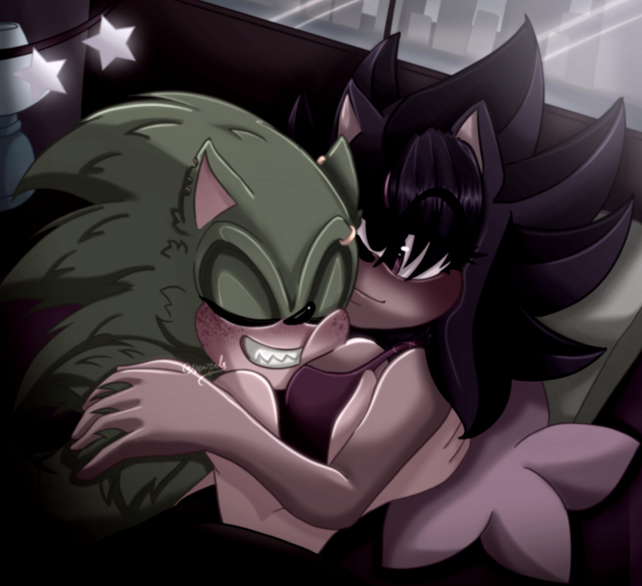 Excerpt: Scourge's question was met with quite a few sideways glances from the patrons filling the bar. However, the hedgehog he was speaking to looked him up and down curiously. Her gaze was virtually unreadable—not quite an invitation, but not quite scornful or dismissive yet, either. She was perched on the chair gracefully, legs crossed, drink in hand, phone in the other.